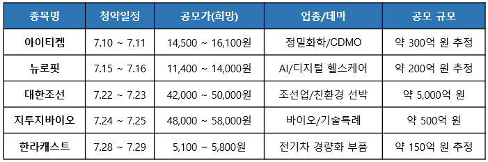 7월 공모주 청약 일정 요약표